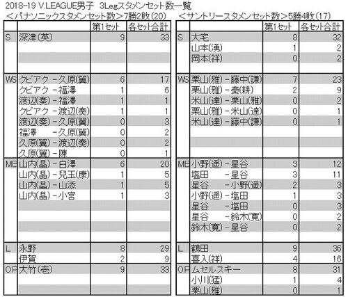 <2018-19V.LEAGUE男子 3Legスタメンセット数一覧>男子中段グループは本当に混戦模様でした。堺は3Legを7勝2敗で順位を上げファイナル6入り。ジェイテクトはファイナル6入りを逃す。(※合成WS訂正しました)(スタメンセット数一覧はセッターの隣の選手が左…